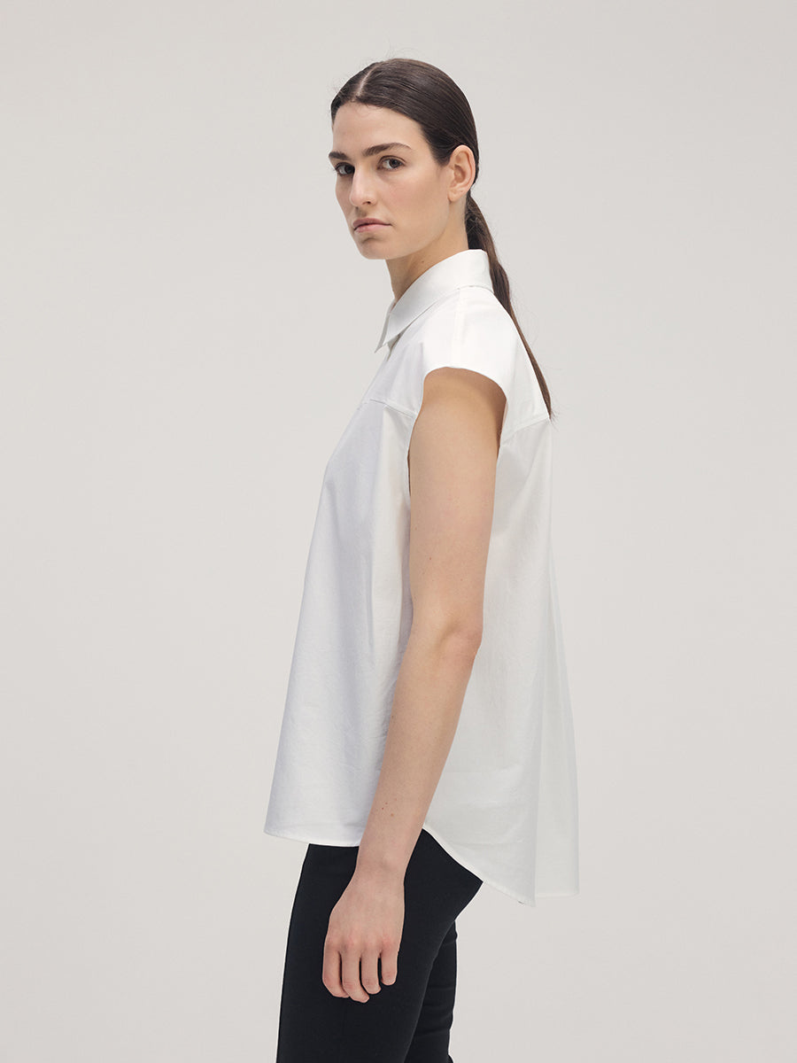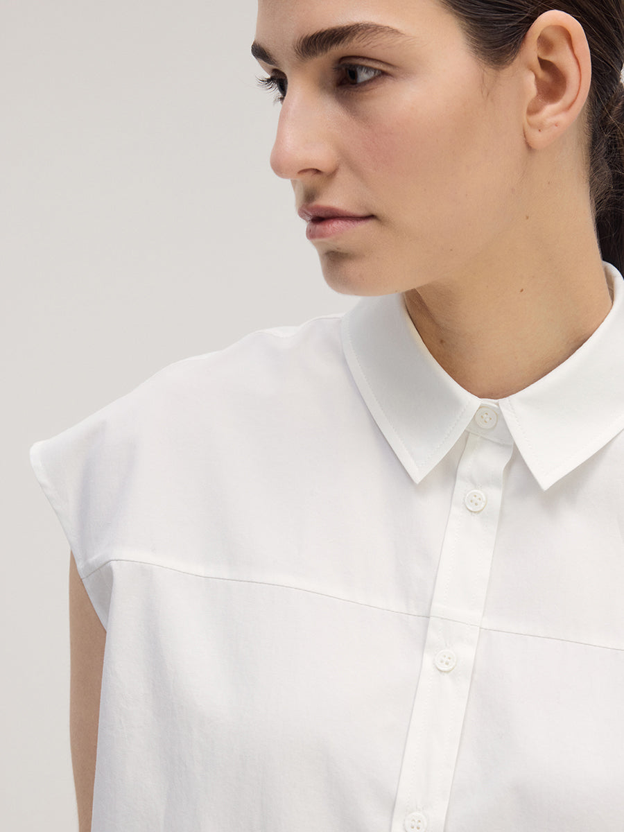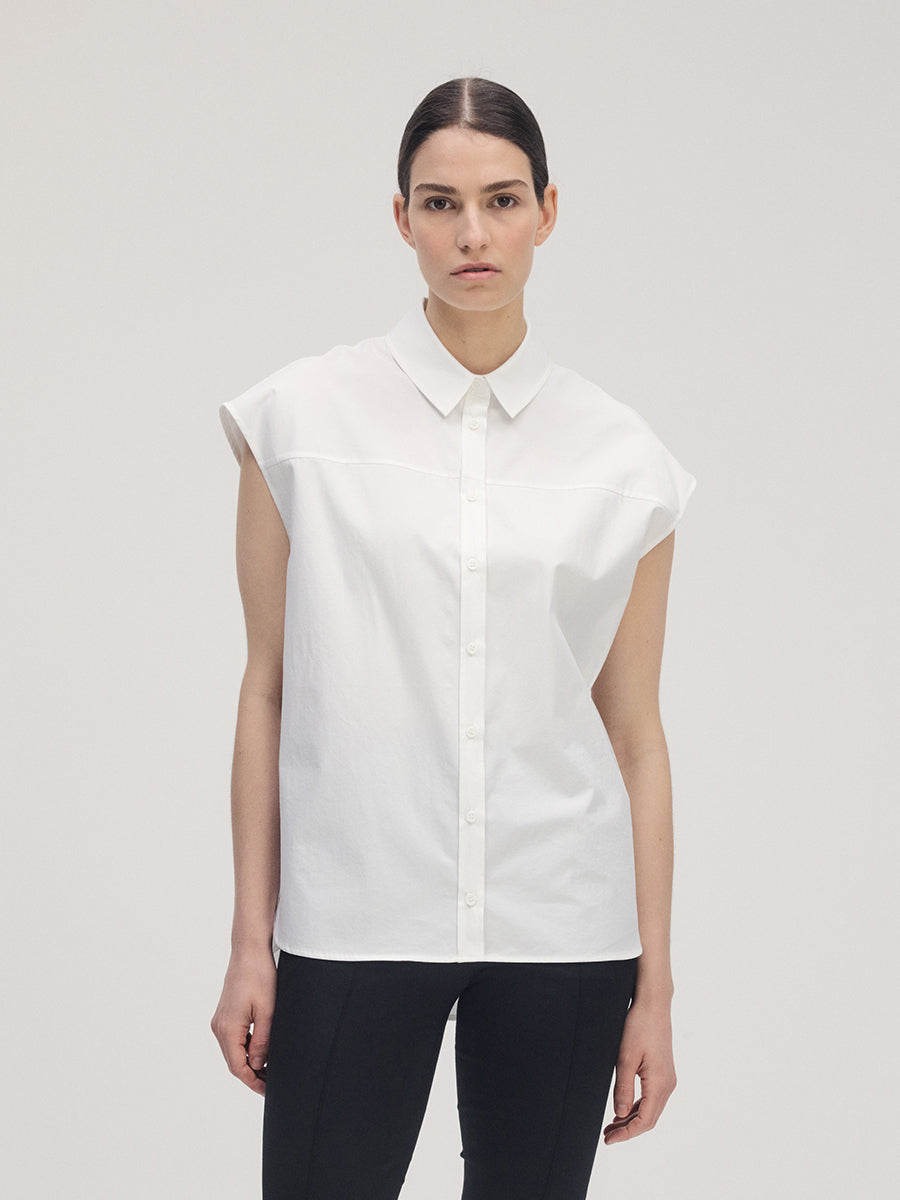 A sleeveless shirt crafted from 100% Japanese cotton that carries a subtle sheen and refined texture. The fabric maintains a crisp hand while draping cleanly, offering both structure and elegance. Designed with softly extended cap sleeves that cover the shoulders, it can be worn comfortably as a sleeveless style. Mother-of-pearl buttons enhance the clean and polished impression.