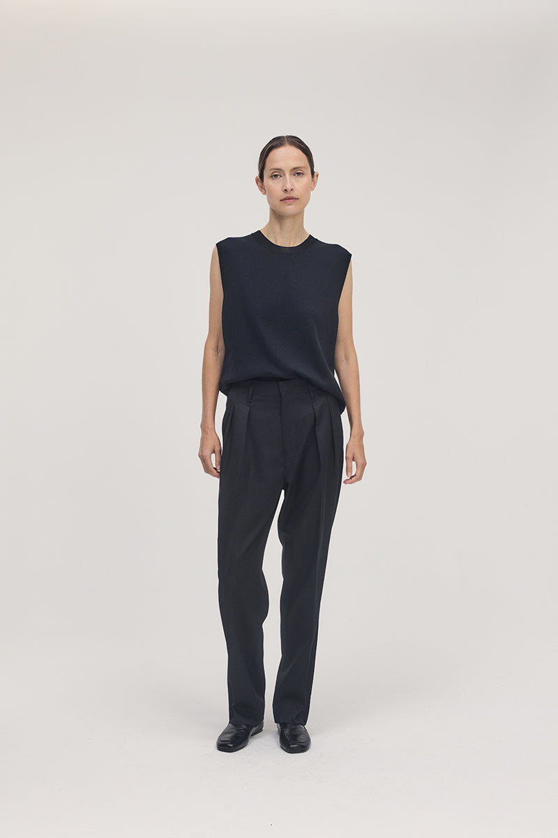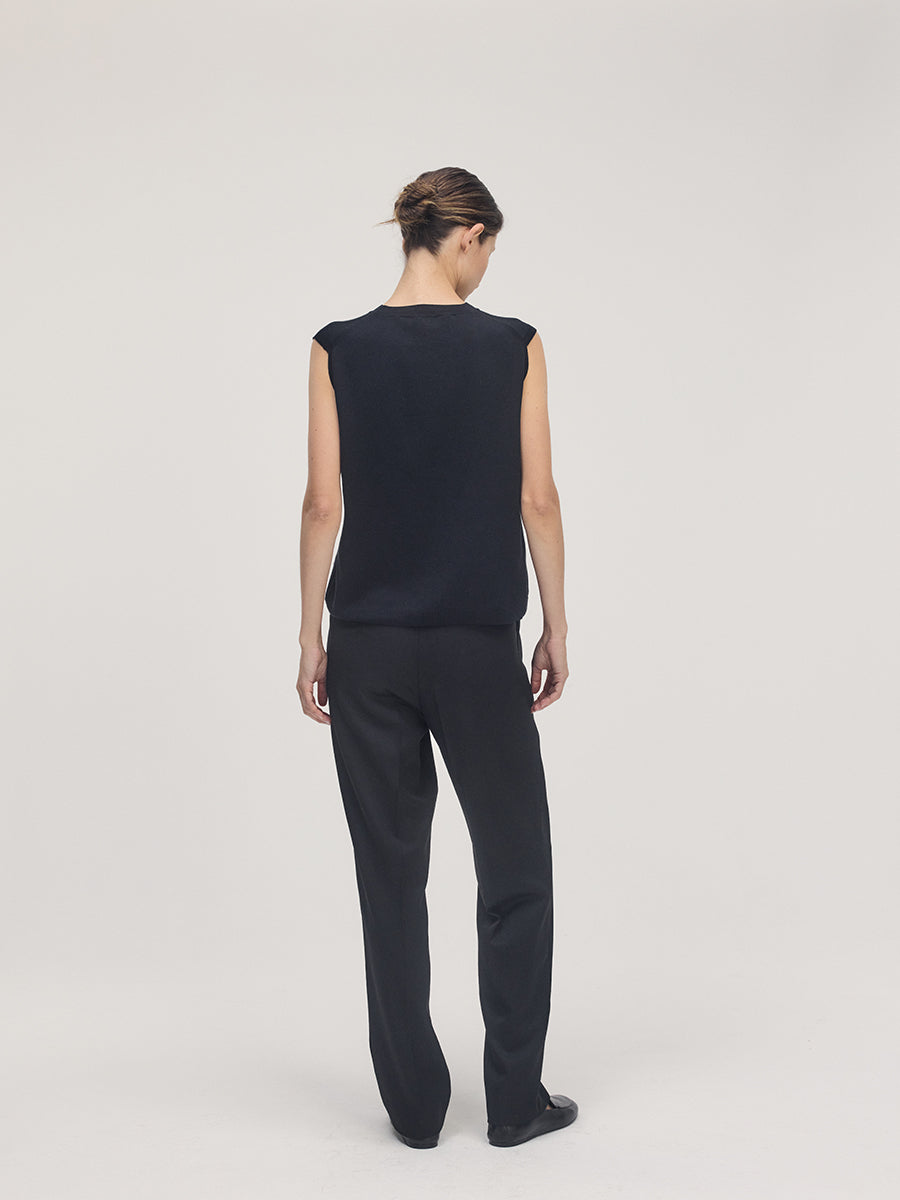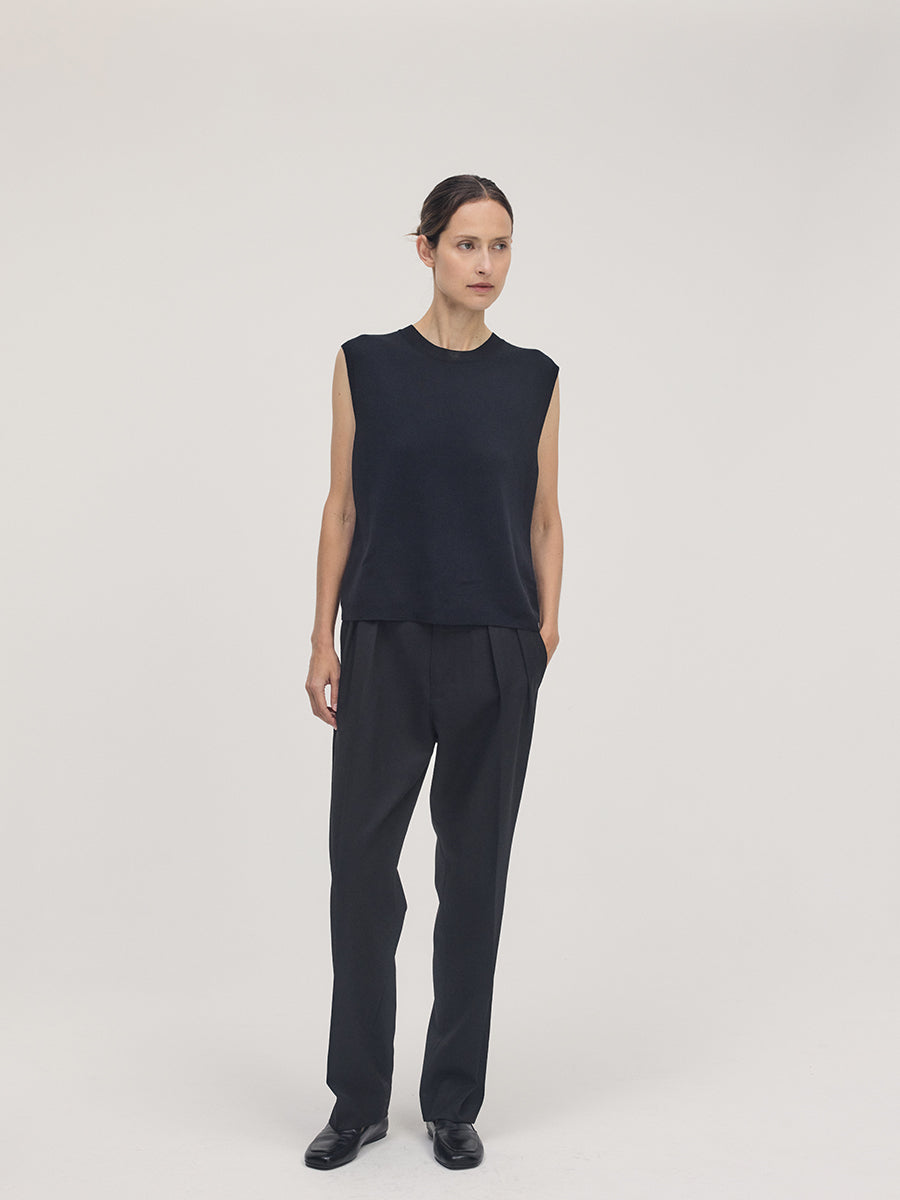 The silhouette is straight and lightly detached from the body to enhance air flow. The shoulder line extends slightly outward, softening the upper arm and creating a clean architectural outline. The armhole is cut generously for ventilation while maintaining coverage and balance. The knit moves easily with air and retains its form without weight or cling. It pairs with tailored trousers or linen skirts for a composed summer look that feels cool and precise.