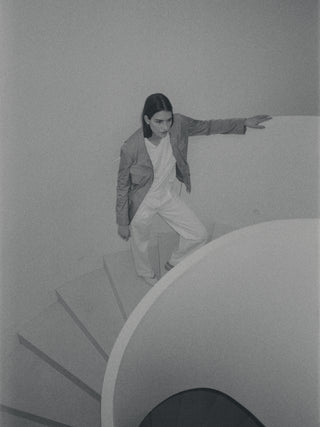 This garment is knitted from 75 percent linen and 25 percent cotton, spun in a Nm 1/27 count and knitted in a 12 gauge 2 ply structure. Linen brings a dry and cool touch, while cotton adds softness and stability to the surface. The 12 gauge construction keeps the fabric light and breathable with a refined grain in texture. Each yarn cone is steam set before knitting to stabilise the twist and preserve precision in shape. The result is a fabric that feels cool, structured, and naturally elegant in motion.
