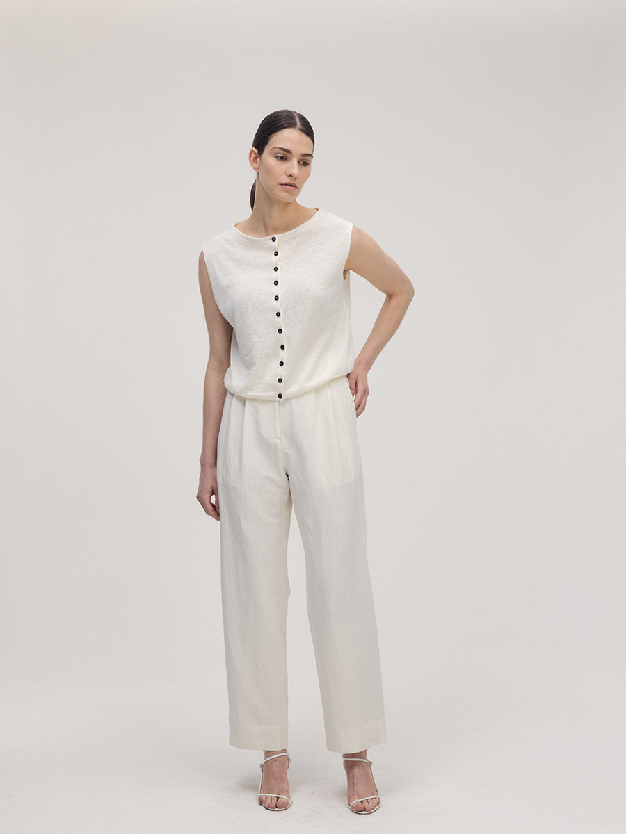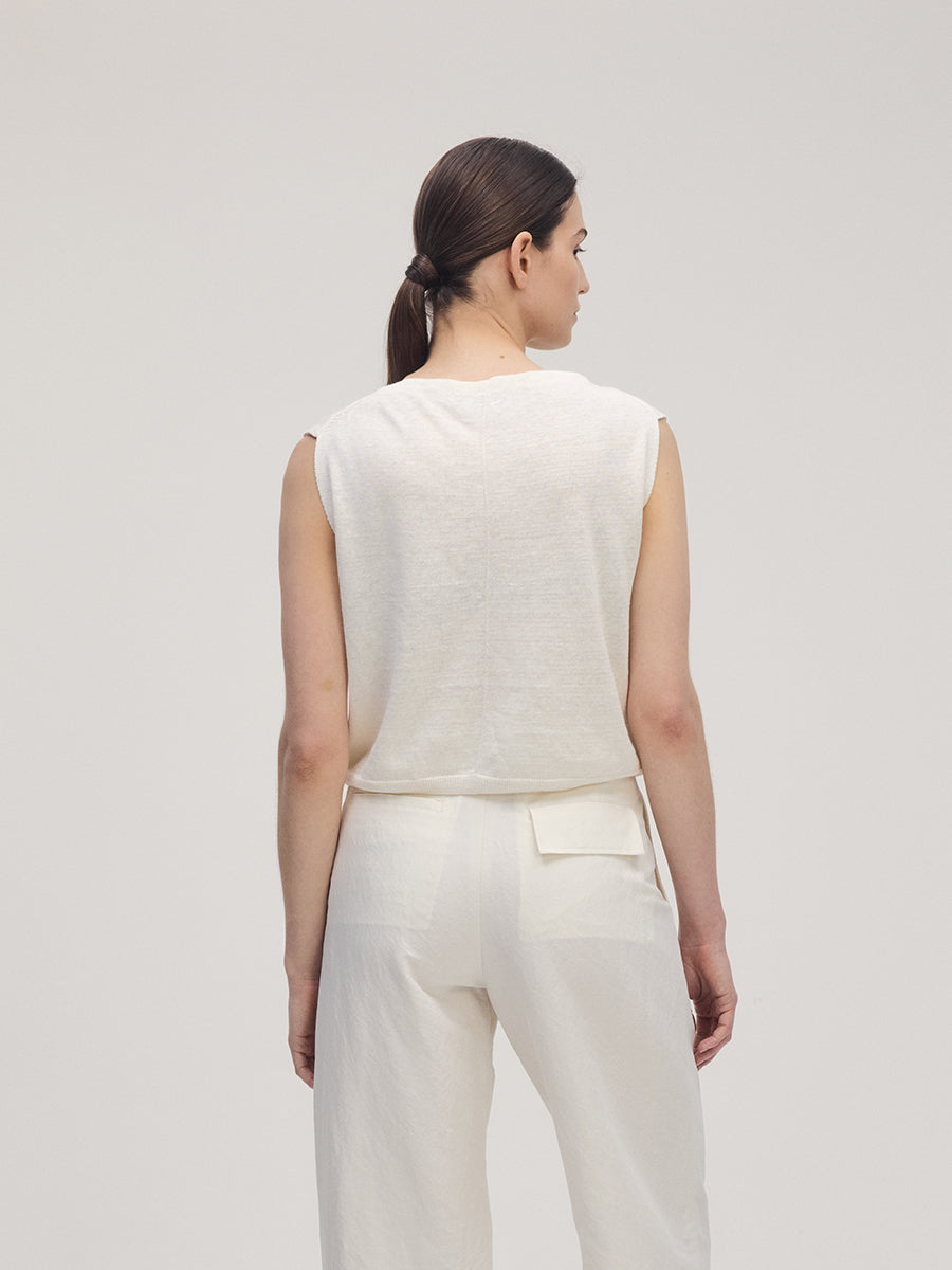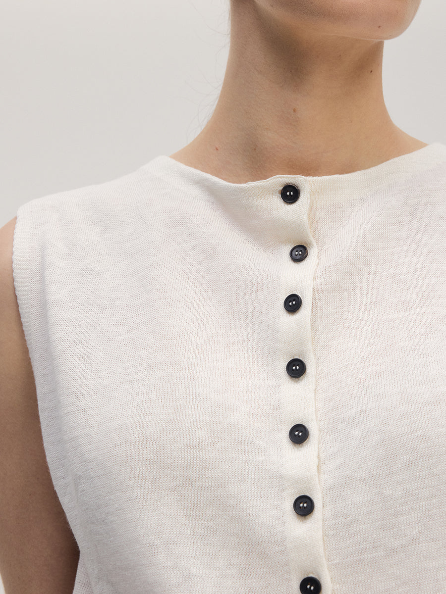 A sleeveless linen knit with a quiet, refined structure. Knitted from 75 percent linen and 25 percent cotton in a 12 gauge 2 ply Nm 1/27 yarn. The surface is dry and cool with a soft matte sheen that rests lightly on the skin. Natural horn buttons run down the front as a subtle detail within the clean silhouette. Airy, balanced, and understated, it embodies the ease of Elune Mode summer.