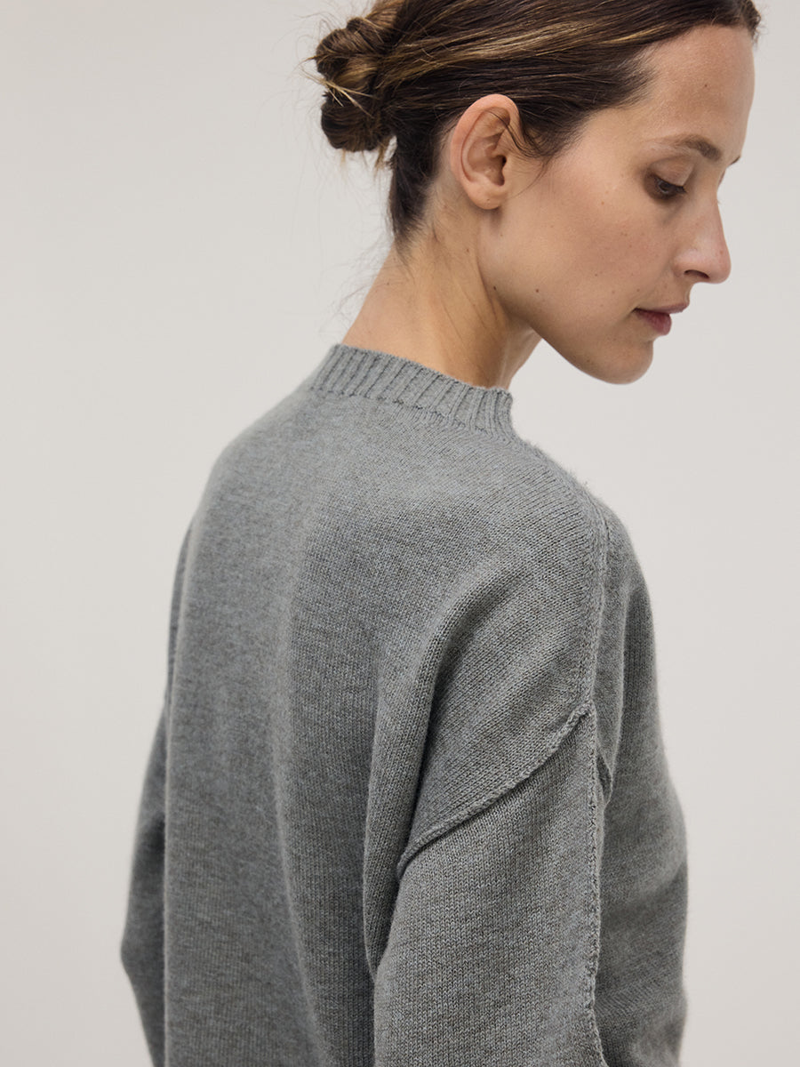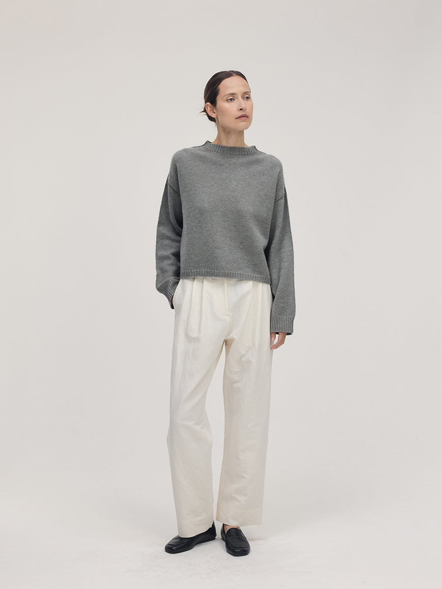 A clean crewneck knit with quiet volume and balanced proportion. Knitted from 100 percent Extrafine Merino Wool in a 10 gauge 2 ply. The neckline rests close to the neck, defining a composed and modern frame. The outer seam draws a clean vertical line through the sleeve and body. Light, refined, and effortless, it embodies Elune Mode’s modern clarity.