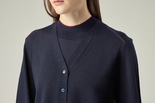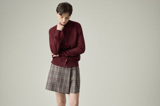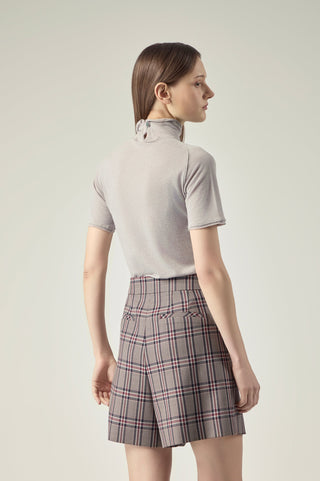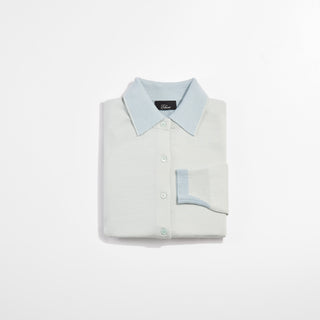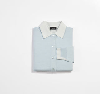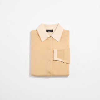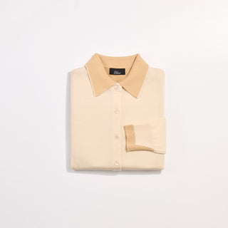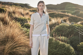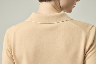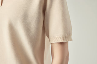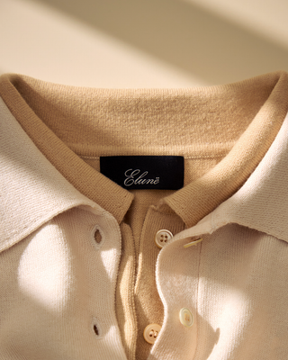 This short-sleeve knit is defined by restraint in design and precision in finish. The double-knitted collar, with its discreet contrast underside, lends a refined architectural touch . A clean buttoned placket continues this quiet balance, making it a piece to wear on its own or layered under EluneMode’s crew-neck cardigan for effortless coordination.