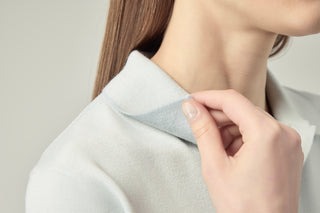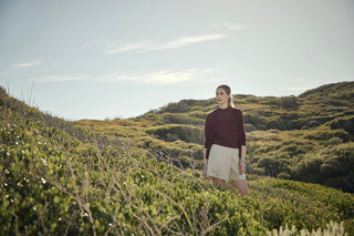Crafted from 80% extra fine Merino wool and 20% cashmere-like viscose, the knit envelops the body in a soft, airy drape. Selected deliberately for spring, it remains light as the weather warms, offering a touch that feels smooth and natural against the skin. Though more demanding to handle, this yarn was chosen with intention because what touches the body should feel honest and alive.