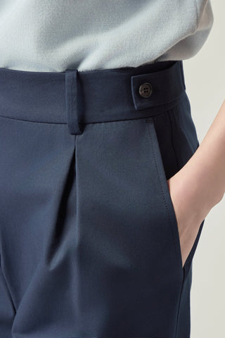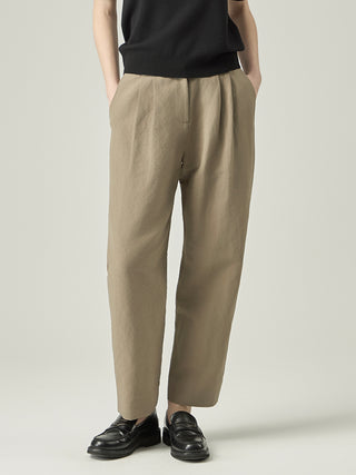 Crafted from a linen–rayon blend with a natural cool touch and a hint of stretch, these trousers combine ease with structure.The fabric holds its line so the fit stays sharp without spreading too wide.A discreet side elastic gives comfort at the waist, allowing the fit to follow the line of the hips and thighs.This keeps the front smooth and the silhouette clean, offering flexibility without losing shape. Deep pleats enhance the relaxed drape, while oversized belt loops and tailored back pockets balance function with refinement.
