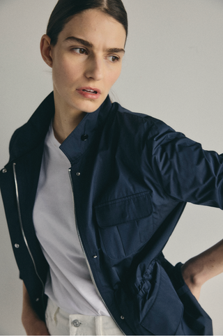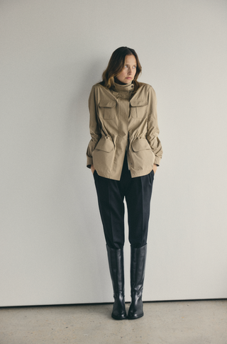 Crafted from wrinkle-resistant memory fabric, this jacket combines light structure with subtle volume and ease. The silhouette can be refined with an internal waist drawstring, shaping the body while keeping a relaxed line. Shoulder gussets allow natural movement, balancing functionality with quiet refinement. The matte surface holds its form beautifully, carrying a sense of modern utility and understated elegance.