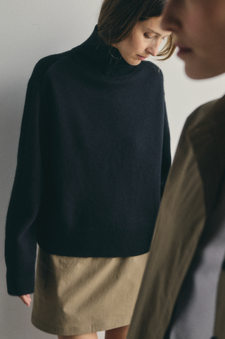 The silhouette carries volume through the upper frame and narrows subtly toward the hem. The shoulder line falls with ease, creating presence without collapse. The high neck stands naturally, framing the face while remaining open at the back for comfort. Despite its density, the knit feels light and fluid, moving softly with the body.
