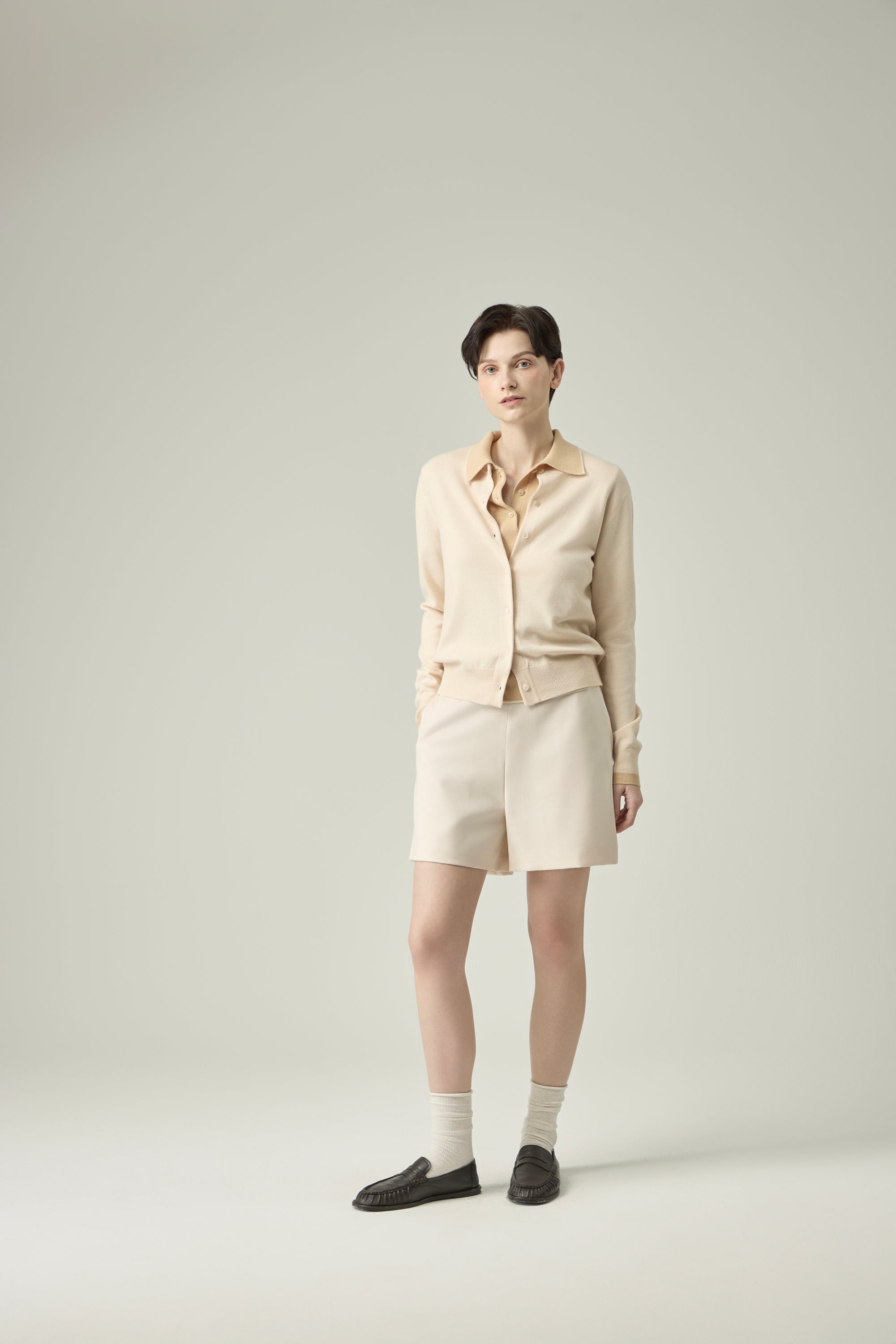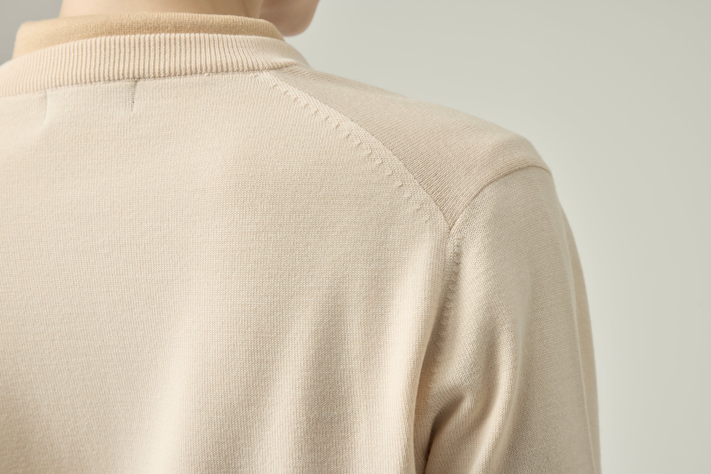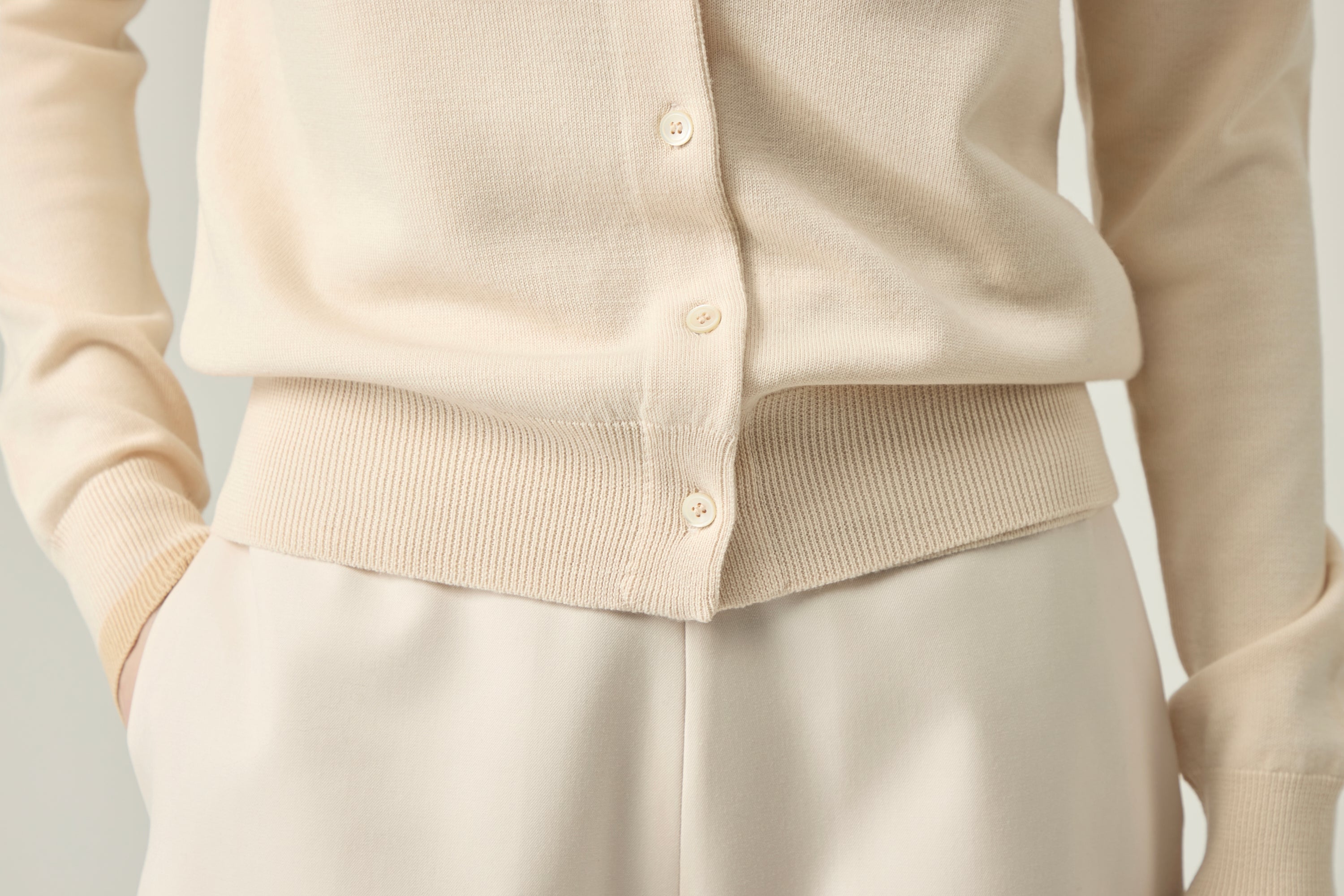 A refined crewneck cardigan crafted from extrafine Merino wool and viscose. Soft and weightless, it carries a clean silhouette that balances structure with ease. Each colour is custom-dyed for Elune Mode, created to hold quiet depth and softness that shifts beautifully with changing light.